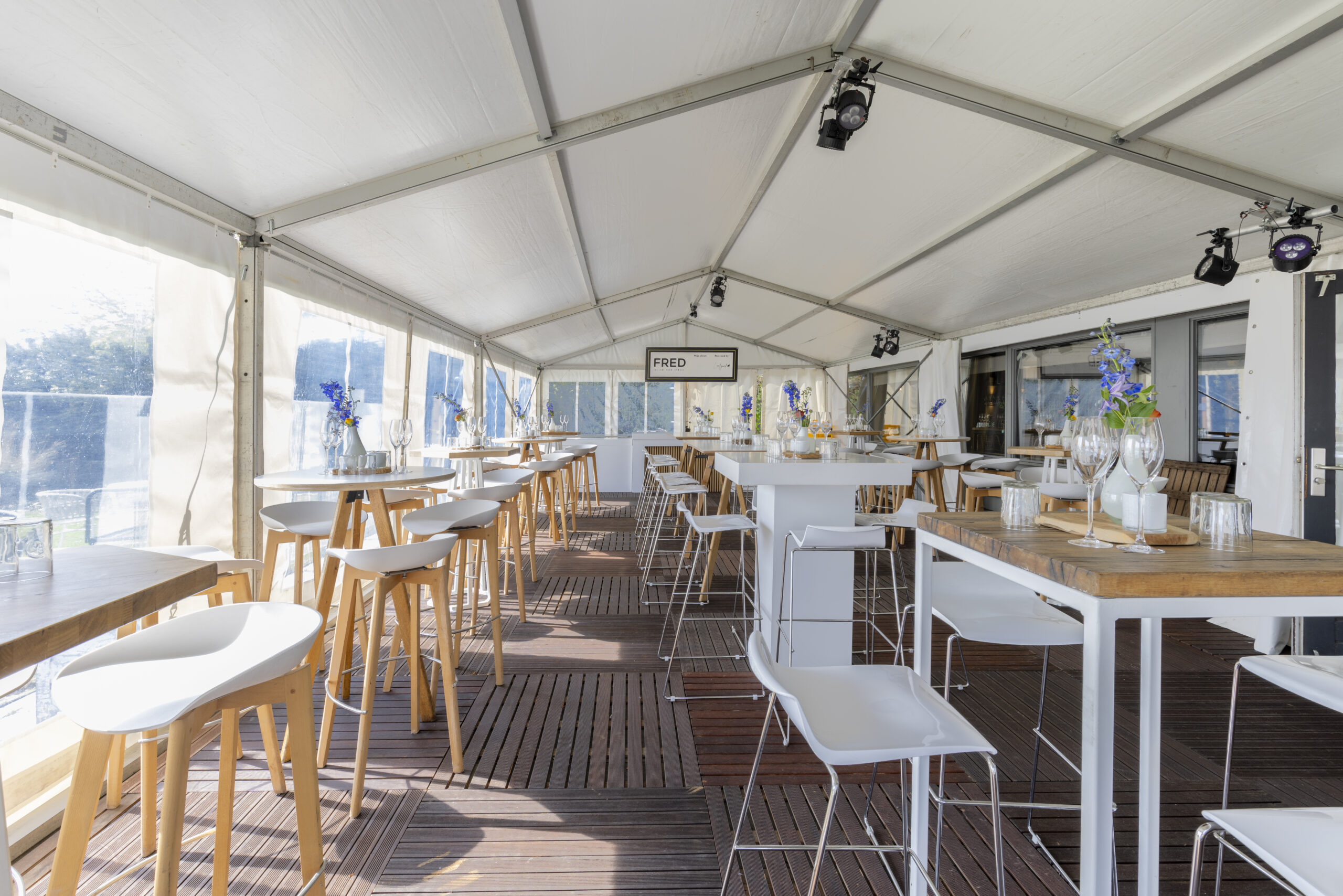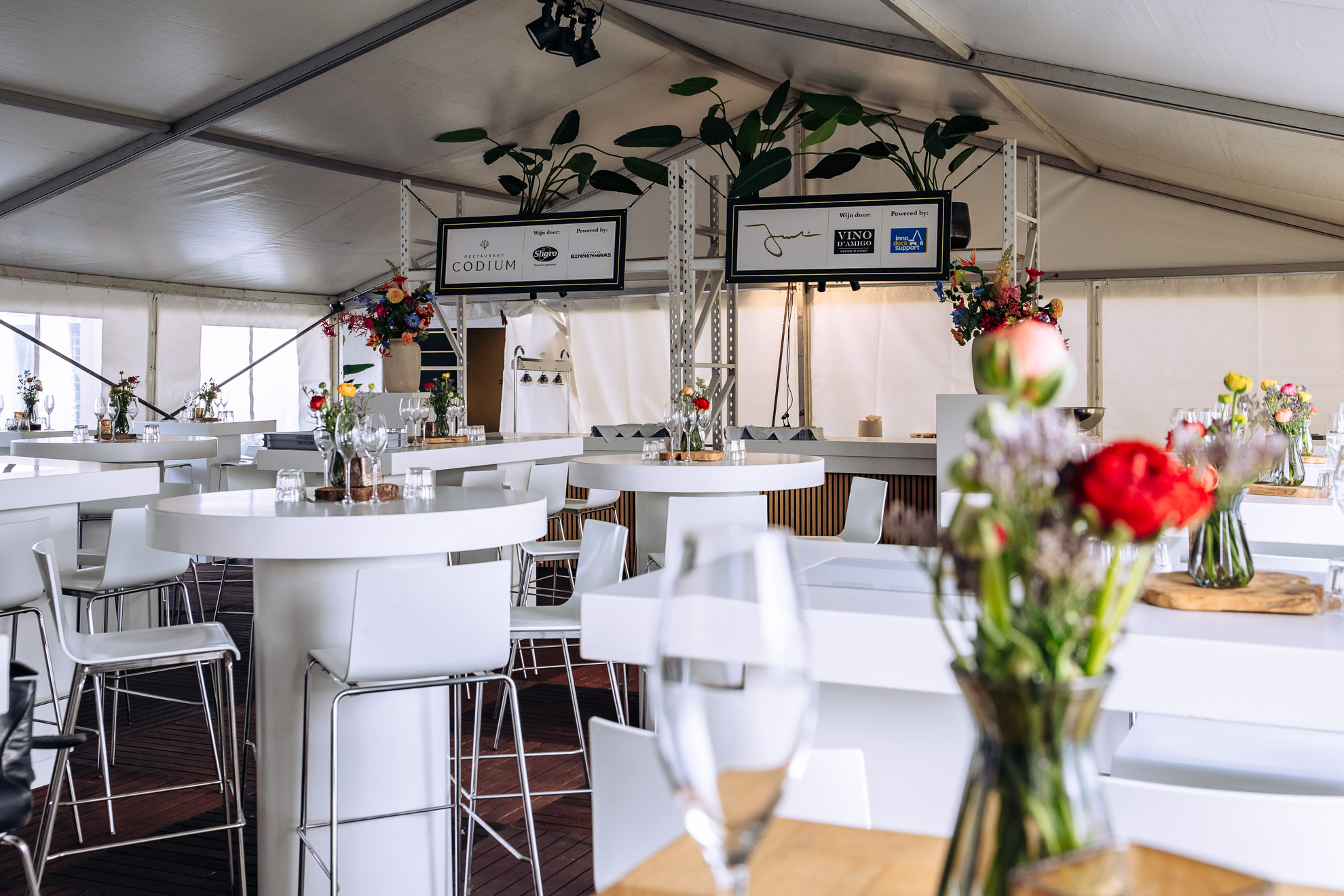 Voor het terras en de entree schakelden we onze vertrouwde partner in voor extra overkappingen. Ook daarvoor verzorgden we de inrichting en gaven de tenten de finishing touch. Dankzij deze uitbreiding konden we alle gasten van het uitverkochte diner een comfortabele plek bieden, ongeacht het weer.