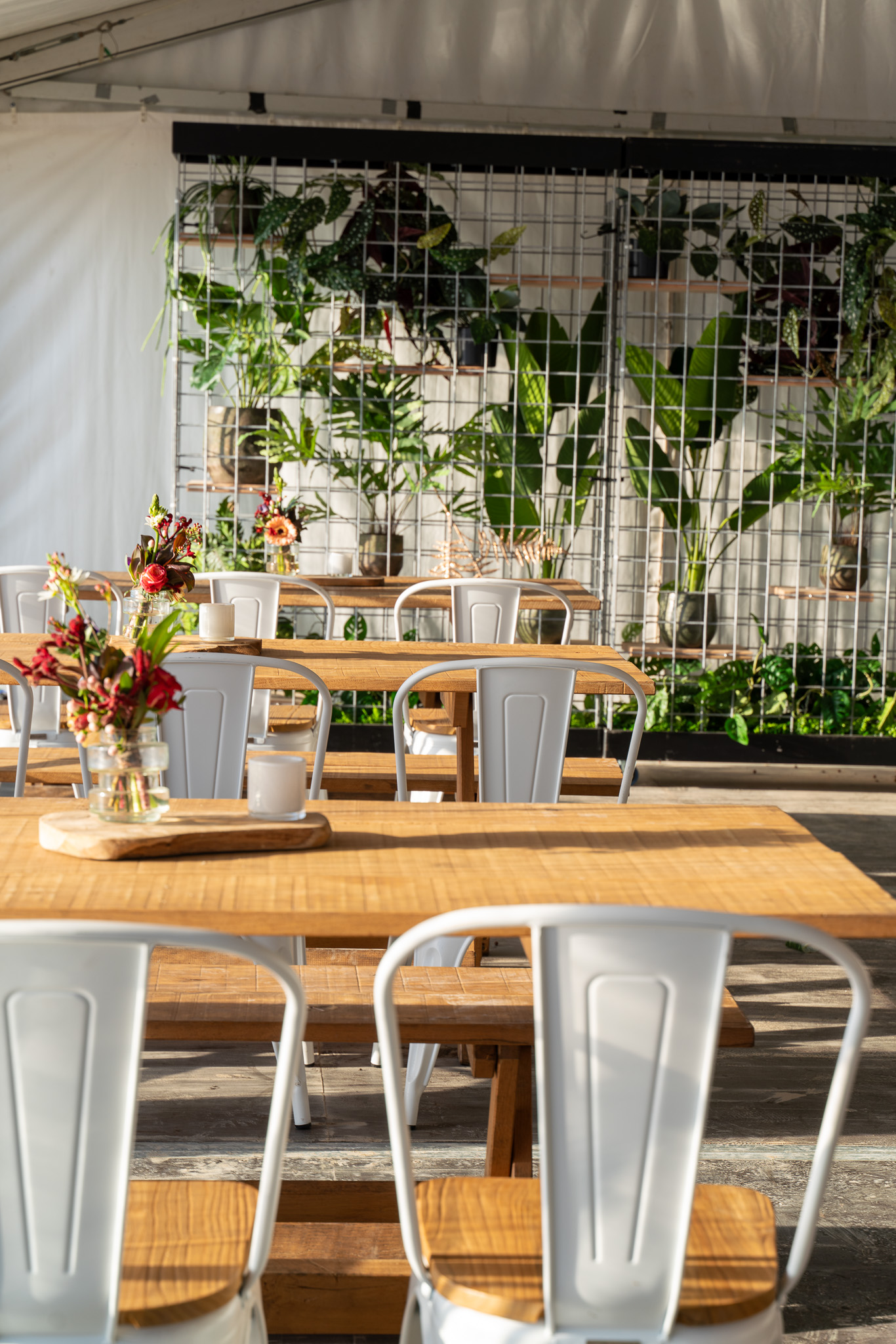 Creëer een modern en stijlvol event met ons Natural White thema. De combinatie van duurzaam hout en strak wit staal geeft een frisse, Scandinavische uitstraling die warmte en karakter samenbrengt.
